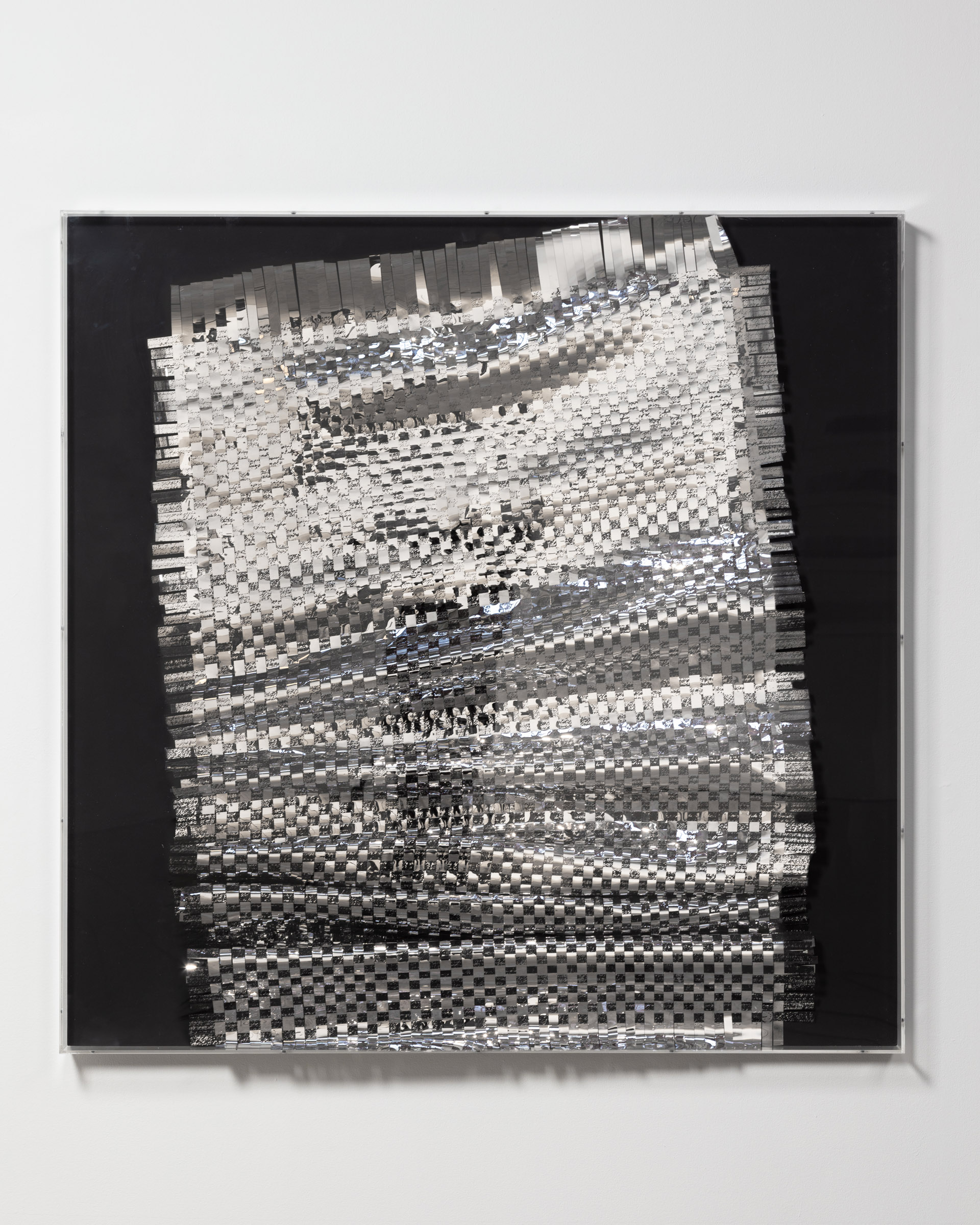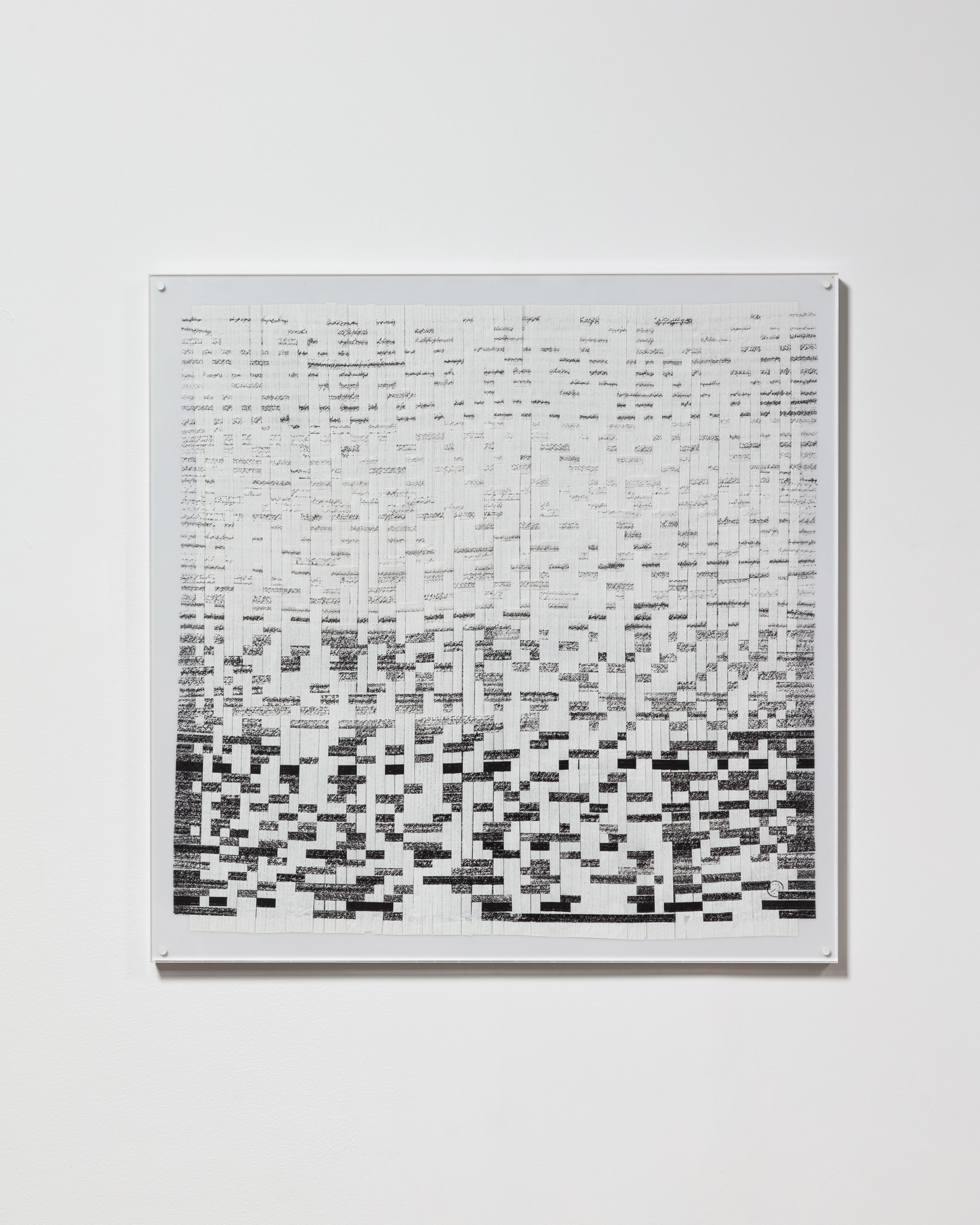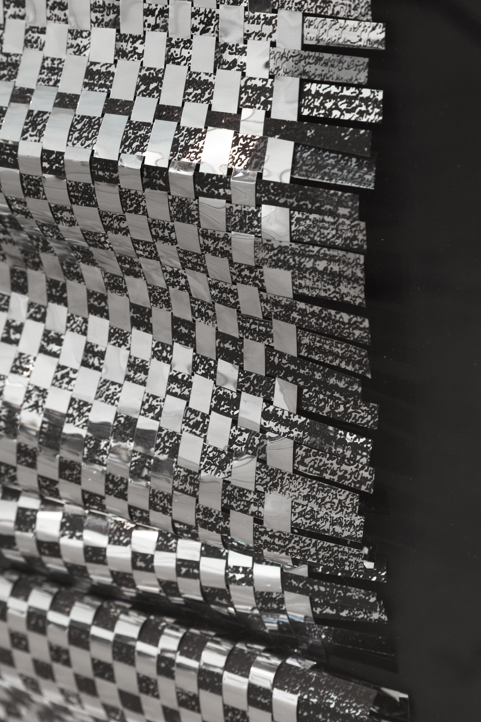 These ephemeral text fragments are used to construct delicate fabric weaves. In some of my newest work I have incorporated mirror-like material along with the calligraphic text, to cause the viewer to self-reflect and be immersed in my woven memory. Other pieces in this series are heavily blacked-out and contemplate the idea of how memories are often truncated and redacted, with only subconsciously selected fragments retained. By infusing sculptural elements with my earliest memories, I am using my process to preserve the more powerful reminiscences that have permanently lived with me over the test of time.”